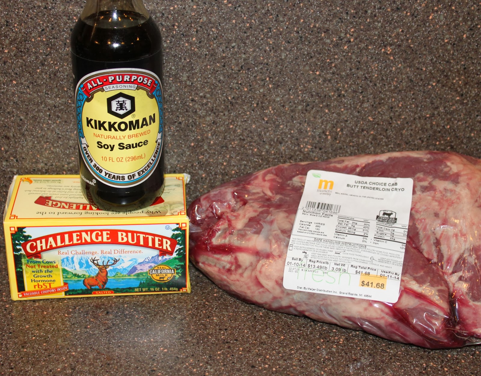 Place roast into a shallow, glass baking dish. Pour soy sauce and melted butter over the tenderloin.